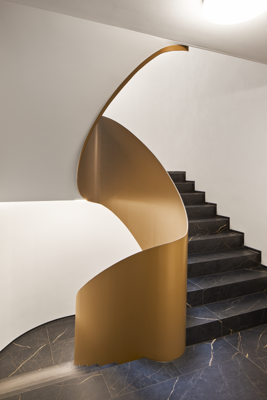 Die Innenraumgestaltung zeichnet sich durch Massivparkett, raumhohe Türen und präzise ausgeführte Schattenfugen aus. Großformatige Fliesen in den Bädern minimieren den Fugenanteil und schaffen eine ruhige, großzügige Anmutung. Holz-Aluminium-Fenster sorgen für einen hohen Tageslichteinfall und tragen zu einer angenehmen Wohnatmosphäre bei. Das Treppenhaus erzielt mit seinem elliptischen Treppenauge eine besondere räumliche Wirkung und setzt den hochwertigen Innenausbau auch in der Erschließung fort.