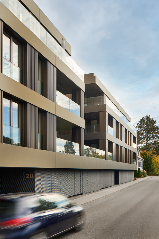 Es sind 15 Wohneinheiten von der Zwei-Zimmer-Wohnung bis zum Penthouse-Loft entstanden. Die Anlage wurde auf einem verbindenden Sockelgeschoss in zwei Baukörper aufgeteilt. Die Fassadengestaltung kombiniert innovative Materialien mit einer präzisen Verarbeitung. Unsichtbar befestigte Alucobond-Paneele in Verbindung mit profilierten Fassadentafeln erzeugen einen changierenden Bronzeton. Ergänzt durch eloxiertes Streckmetall entsteht eine dynamische Interaktion von Licht und Struktur.