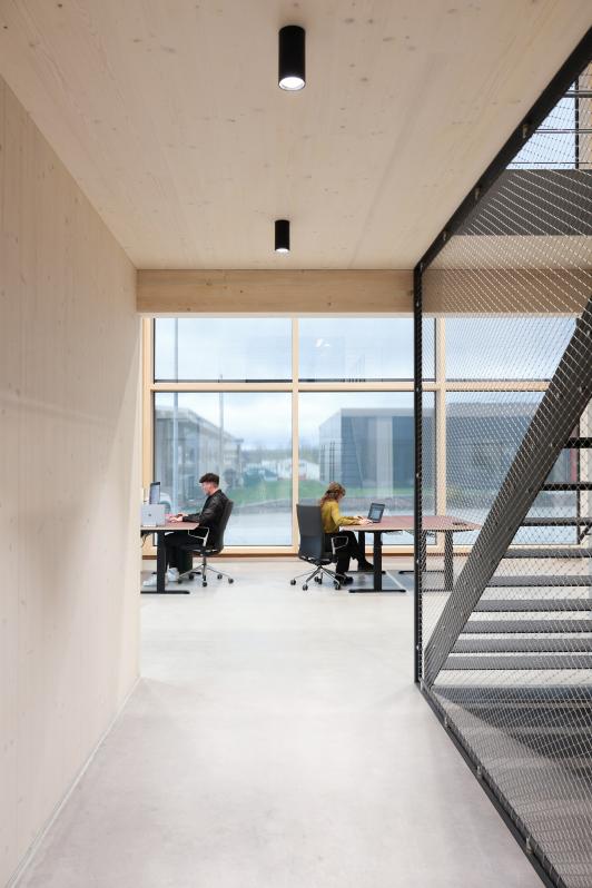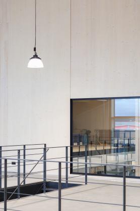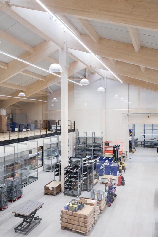 CLT-Vollholzwände bleiben sichtbar, Installationen werden nicht versteckt, sondern sorgfältig geführt, die Bodenplatte aus Beton ist flügelgeglättet, geschliffen und imprägniert. Abgehängte Decken kommen nur dort zum Einsatz, wo akustische Anforderungen es erfordern, etwa im Verwaltungsbereich. Präzise gearbeitete Holzzargen an den Oberlichtern zeugen von handwerklicher Detailgenauigkeit. Transparenz und Kommunikation werden zur Raumstrategie: Großzügige, innenliegende Fenster erlauben Blicke von der Produktionshalle in die Besprechungs- und Aufenthaltsräume.