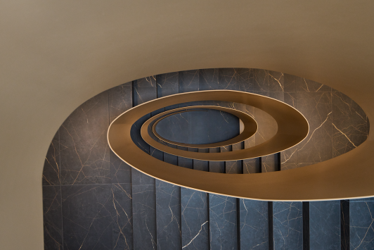 Die Innenraumgestaltung zeichnet sich durch Massivparkett, raumhohe Türen und präzise ausgeführte Schattenfugen aus. Großformatige Fliesen in den Bädern minimieren den Fugenanteil und schaffen eine ruhige, großzügige Anmutung. Holz-Aluminium-Fenster sorgen für einen hohen Tageslichteinfall und tragen zu einer angenehmen Wohnatmosphäre bei. Das Treppenhaus erzielt mit seinem elliptischen Treppenauge eine besondere räumliche Wirkung und setzt den hochwertigen Innenausbau auch in der Erschließung fort.