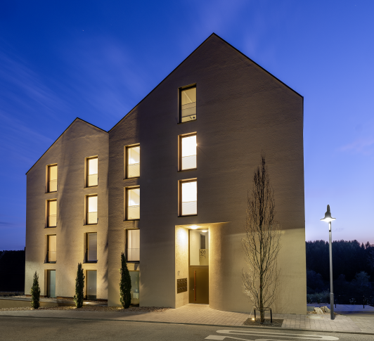 Natur und historischer Stadtkern gehen in Dornstetten direkt ineinander über. Beide Vorzüge bringt das Gebäude, das an der Hangkante am Rande des historischen Stadtkerns von Dornstetten steht. Die unverbaubare Aussicht nach Südwesten ermöglicht eine klare Ausrichtung und Zonierung der Wohnungen: Die Bewohner blicken in die freie Natur. Das Wohnhaus wurde harmonisch in die Umgebung integriert.