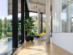 Das Raumkonzept erstreckt sich über vier Etagen mit insgesamt 4.000 m² Fläche und bietet Raum für 180 Arbeitsplätze. Der Fokus liegt auf großen und offenen Flächen, die Abteilungsgrenzen auflösen und interdisziplinäre Zusammenarbeit fördern. Flexible Raumstrukturen ermöglichen eine schnelle Anpassung an zukünftige Entwicklungen, ohne dass aufwendige Umbauten nötig sind. Der zentrale Treppenraum mit Split-Level-Elementen und großflächigen Lufträumen schafft eine Verbindung zwischen den Geschossen und sorgt für eine lichtdurchflutete Atmosphäre.