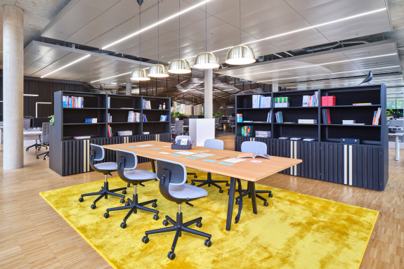 . Die Gestaltung des Innenraums greift die charakteristische Giebellandschaft Freudenbergs auf und integriert sie in Form von Deckenskulpturen und architektonischen Elementen. Die Büroflächen sind offen und flexibel konzipiert, um spontane Zusammenarbeit und agile Teamarbeit zu fördern. Marktplätze, Lounges, Bibliotheken sowie Rückzugs- und Besprechungszonen bieten vielfältige Arbeitsmöglichkeiten und unterstützen eine moderne Unternehmenskultur ohne starre Hierarchien.